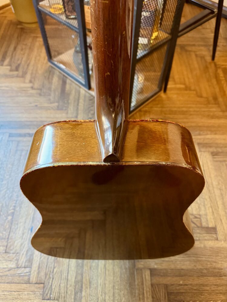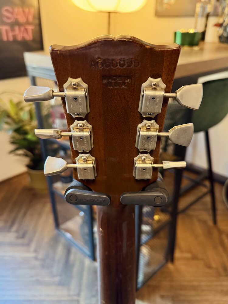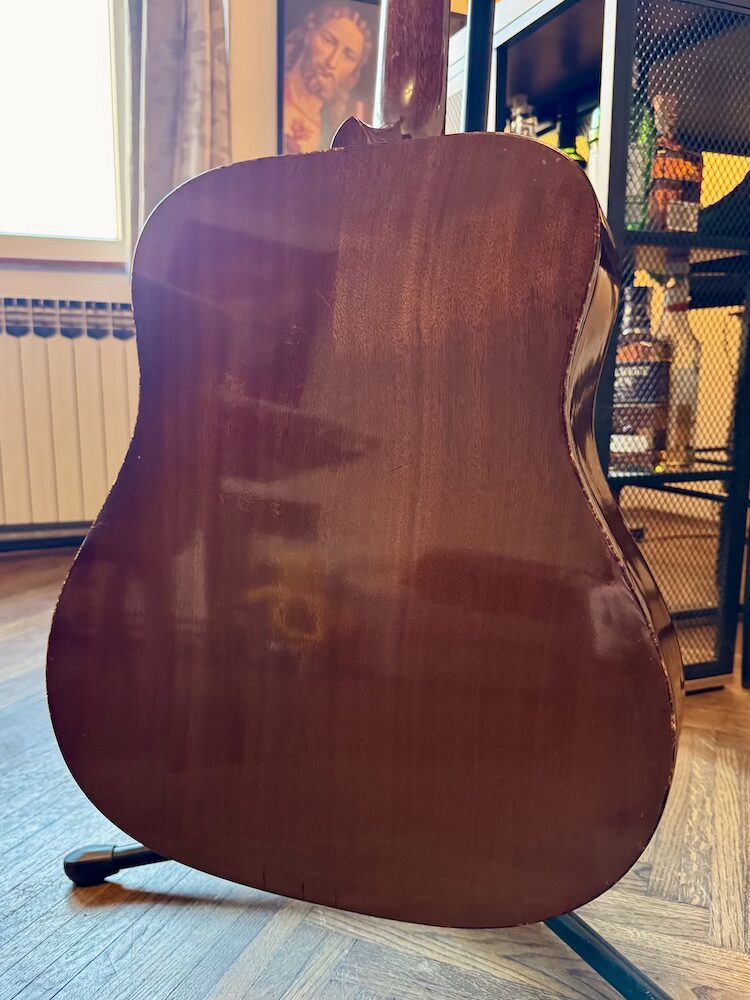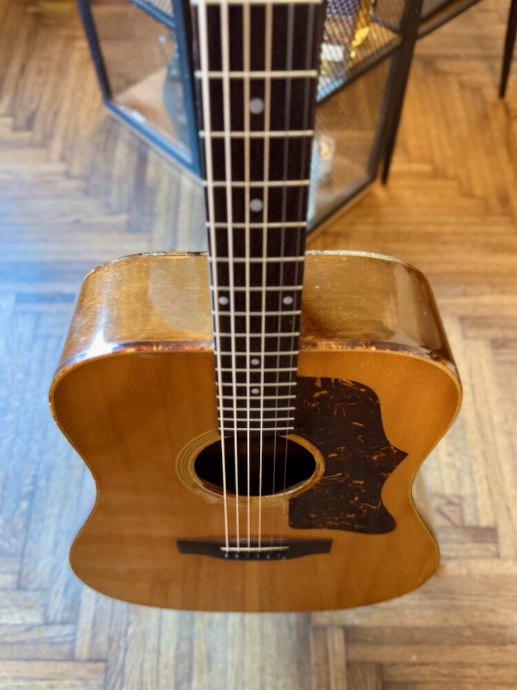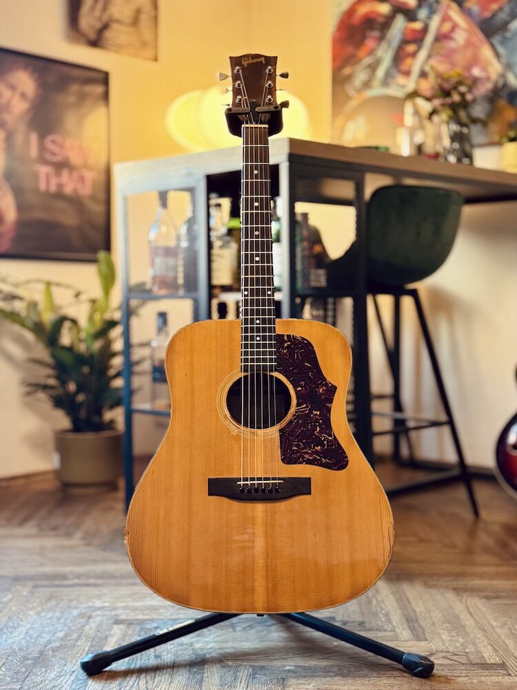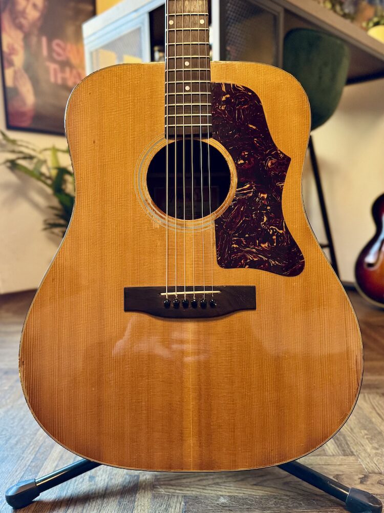 1973 Gibson J-50 Deluxe in original Natural finish. The guitar was made in the Kalamazoo factory during the Norlin era when some novelties were introduced: square shoulders, open book headstock and most importantly they rejected the adjustable bridge concept. The second most important change is the reinforced double bracing in the X form. Sitka on the front panel, Honduras mahogany on the back and sides. The neck is also made of Honduras mahogany just like the fretboard and bridge. Binding is a double tortoise.  The guitar is very light and extremely resonant, killer sounding.  It had two small cracks on the top pro repaired a long time ago, but it’s almost invisible. The strings are low, and the neck is very easy to play. The guitar comes with a period-correct and non-original hard case.