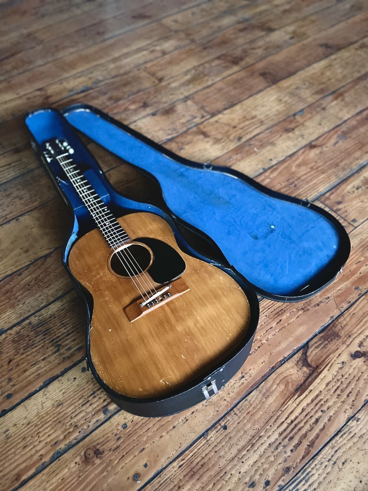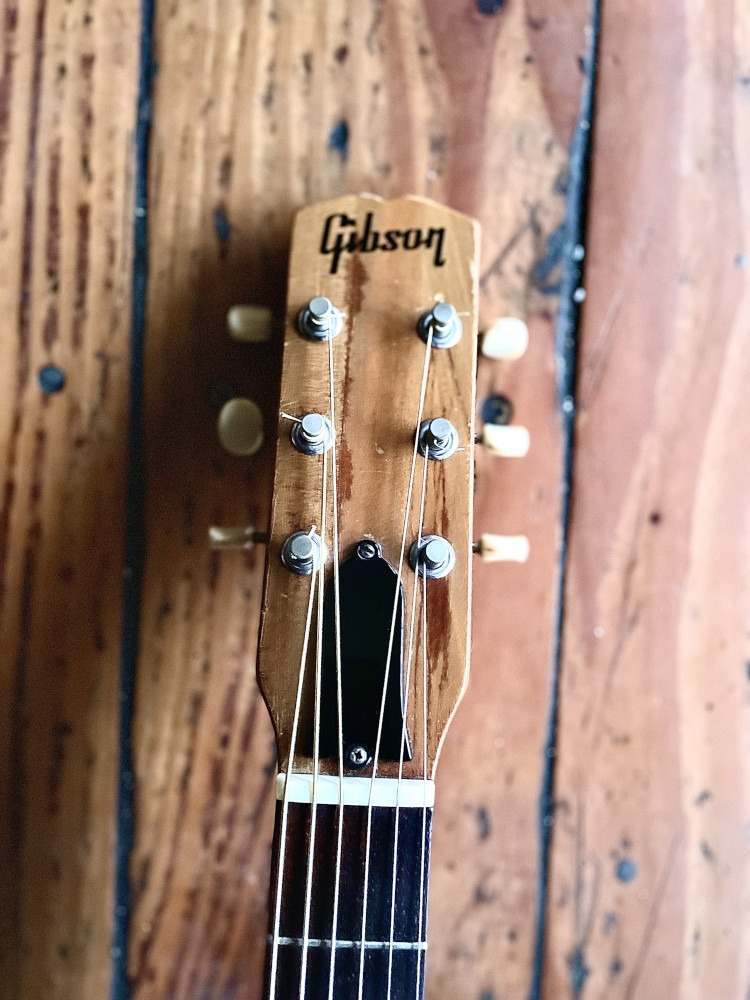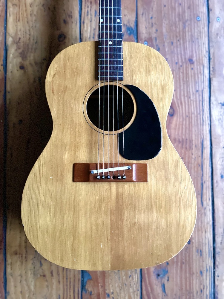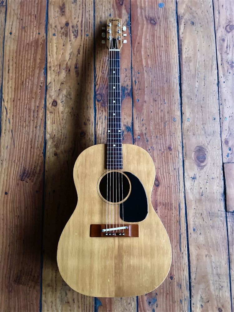 The Gibson acoustic B-15 series was produced between 1966 – 1969. This guitar is from 1967 and in great condition, just some minor dings and dongs and weather checking, but the guitar has no issues, repairs, or cracks. The B-15 was the affordable Student model, made of solid tonewoods and had a warm, full, and rich sound. Your chance to get an affordable vintage Gibson flat-top guitar for low money! The guitar comes in its original cardboard chip case. Techn. details: • Mahagony body with a solid back, • solid Spruce top, • 1-piece midsize mahogany neck, • rosewood fretboard with dot inlays. • 20x frets, • Scalelength: 24 3/4 (ca. 63cm) • 2×3 open-back tuners w/white plastic buttons, • Rosewood bridge w/adjustable wooden saddle, • Natural – nitro lacquer (satin finish), • incl. orig. softshell-case.