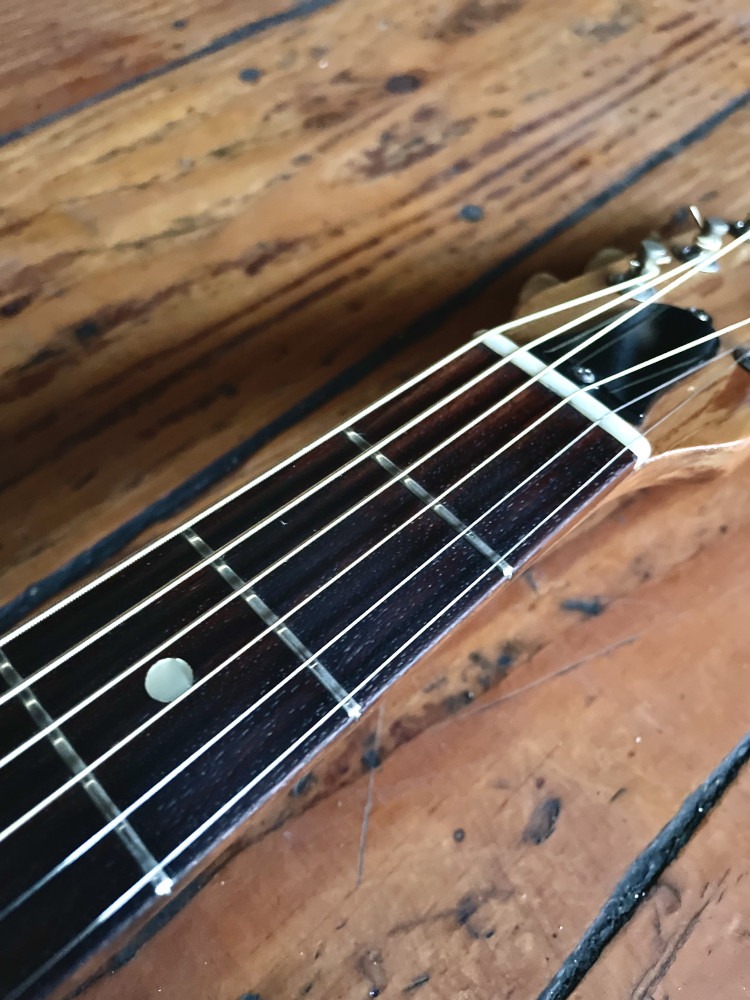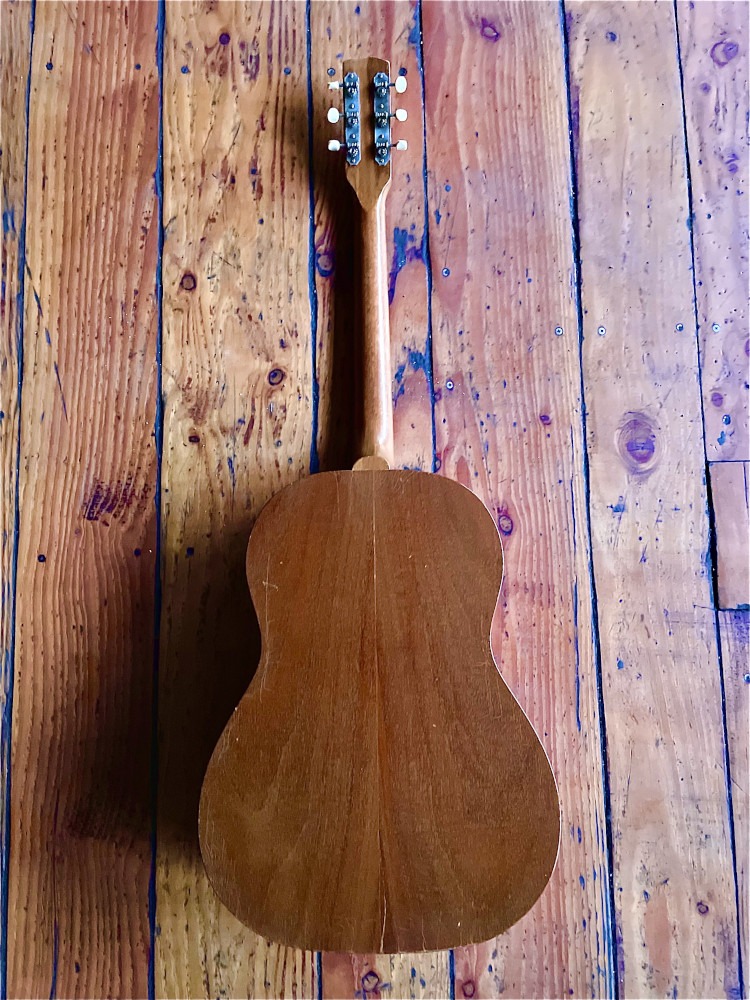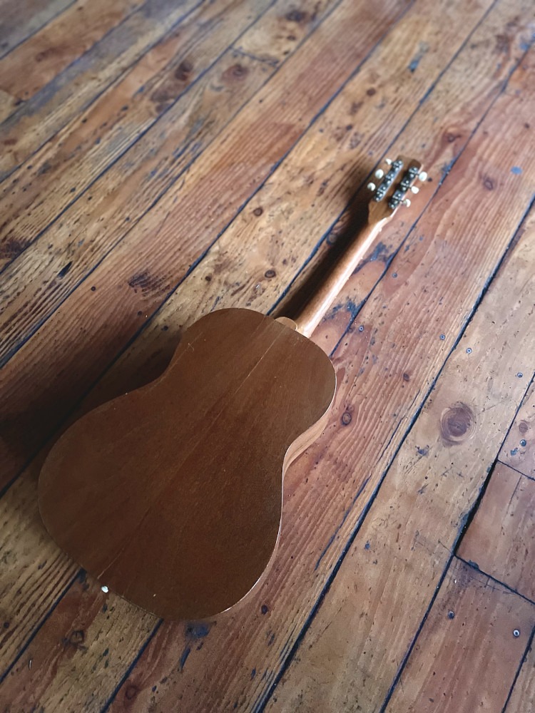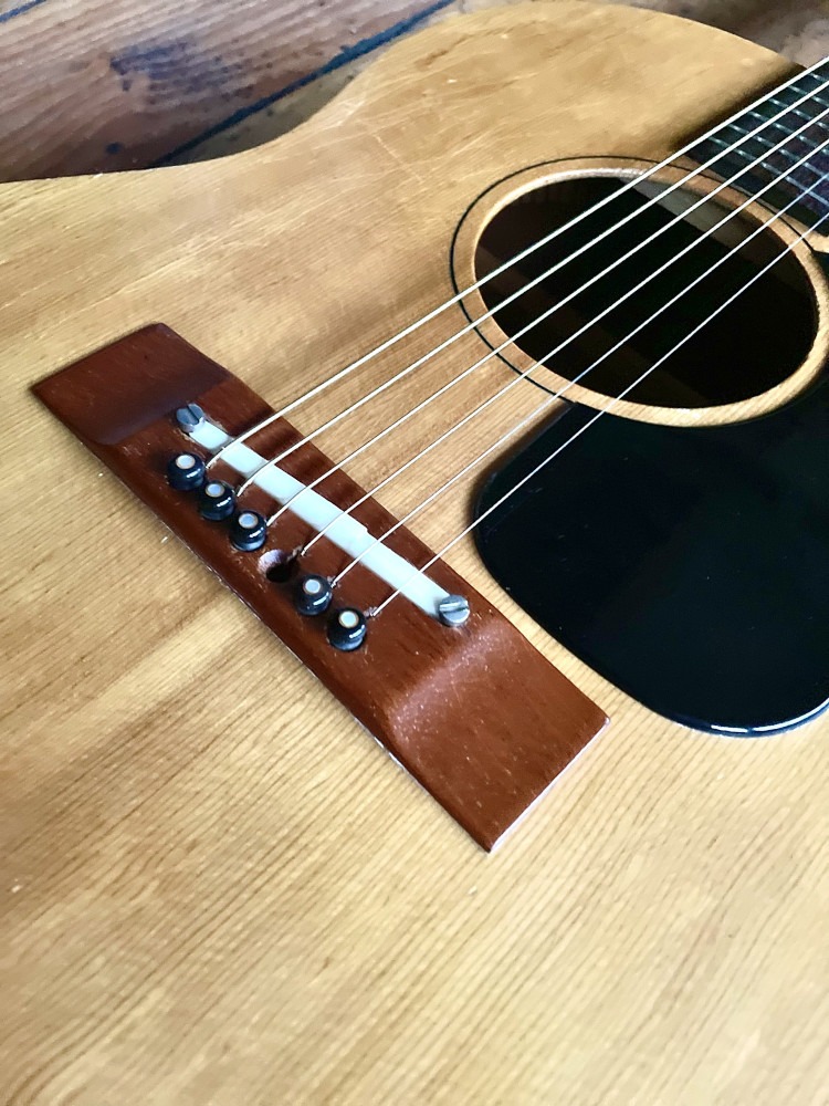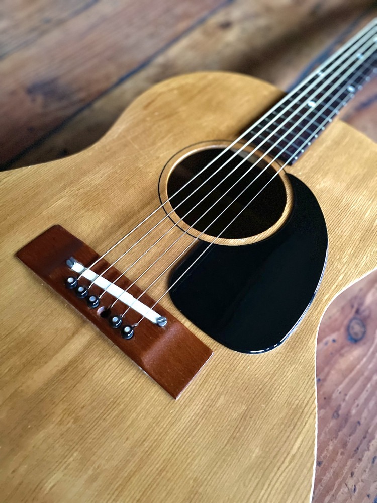 The Gibson acoustic B-15 series was produced between 1966 – 1969. This guitar is from 1967 and in great condition, just some minor dings and dongs and weather checking, but the guitar has no issues, repairs, or cracks. The B-15 was the affordable Student model, made of solid tonewoods and had a warm, full, and rich sound. Your chance to get an affordable vintage Gibson flat-top guitar for low money! The guitar comes in its original cardboard chip case. Techn. details: • Mahagony body with a solid back, • solid Spruce top, • 1-piece midsize mahogany neck, • rosewood fretboard with dot inlays. • 20x frets, • Scalelength: 24 3/4 (ca. 63cm) • 2×3 open-back tuners w/white plastic buttons, • Rosewood bridge w/adjustable wooden saddle, • Natural – nitro lacquer (satin finish), • incl. orig. softshell-case.